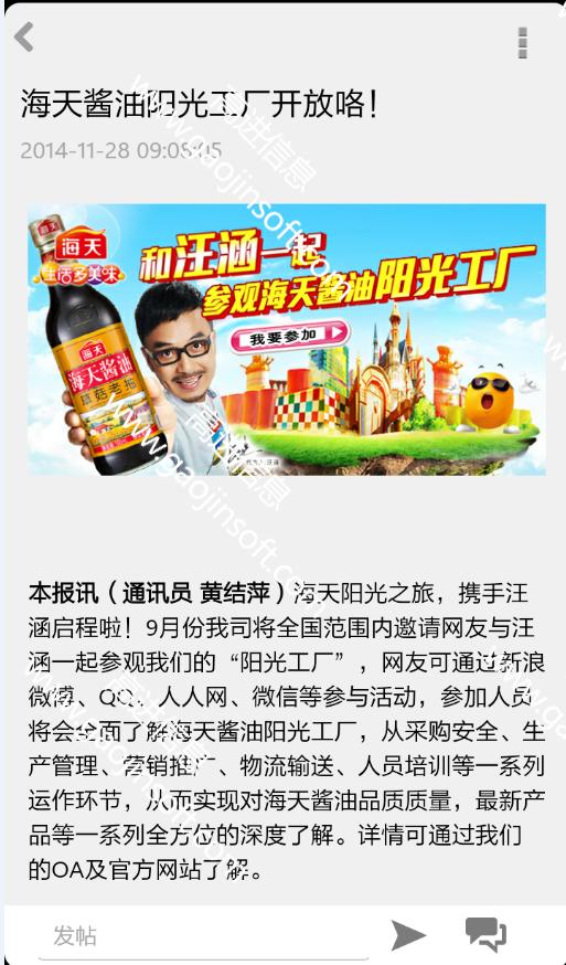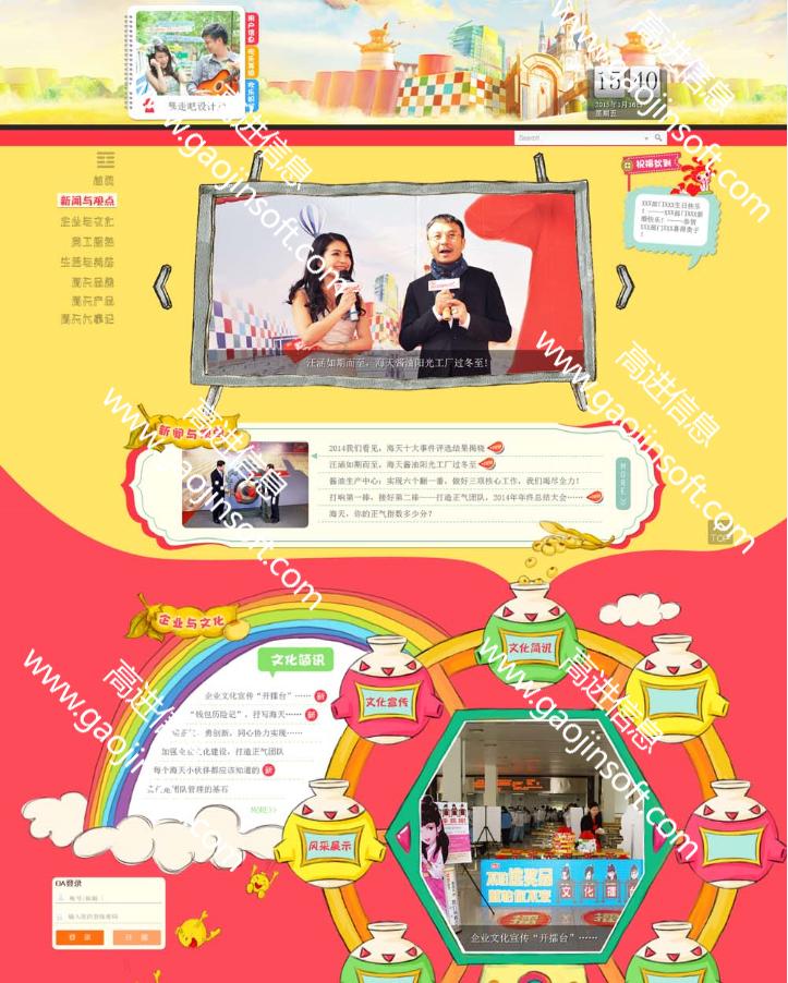2、企業(yè)文化的宣傳平臺,在此網(wǎng)站上面展示公司和內(nèi)部大小新聞,品牌知識和新聞,產(chǎn)品知識和新聞,宣傳片,企業(yè)文化精神理念宣傳、企業(yè)文化活動(dòng)剪影等內(nèi)容,向員工和合作商展示海天公司形象和活力以及積極向上的企業(yè)文化。