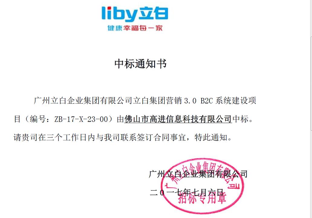 佛山市高進信息科技有限公司憑借豐富的項目管理經驗、雄厚的技術力量和良好的企業(yè)信譽,于2017年7月6日順利中標——廣州立白集團營銷3.0 B2C系統(tǒng)建設項目。