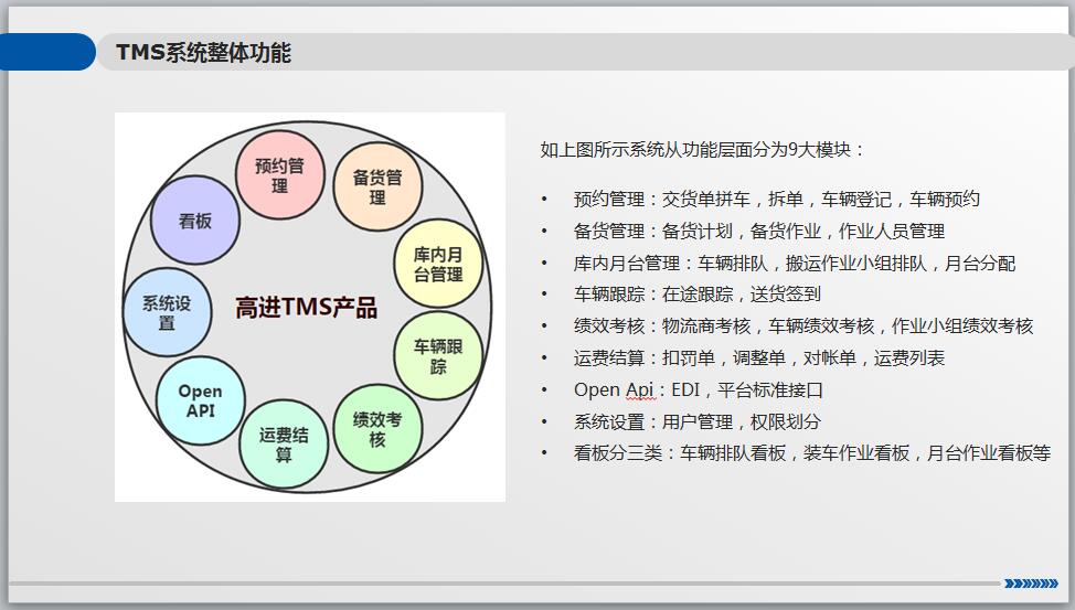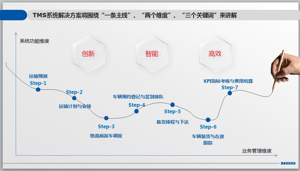 依據(jù)物流構(gòu)想,借助功能完善及軟件集合建立TMS運(yùn)輸管理系統(tǒng),使用訂單執(zhí)行監(jiān)控形成完整的信息流。通過(guò)多種方法和其他相關(guān)的操作一起提高物流的管理能力;包括管理裝運(yùn)單位,指定企業(yè)內(nèi)、外的發(fā)貨計(jì)劃,管理運(yùn)輸模型、基準(zhǔn)和費(fèi)用,維護(hù)運(yùn)輸數(shù)據(jù),生成提單,優(yōu)化運(yùn)輸計(jì)劃,選擇承運(yùn)人及服務(wù)方式,招標(biāo)和投標(biāo),審計(jì)和支付貨運(yùn)賬單,處理貨損索賠,安排勞力和場(chǎng)所,管理文件和管理第三方物流。